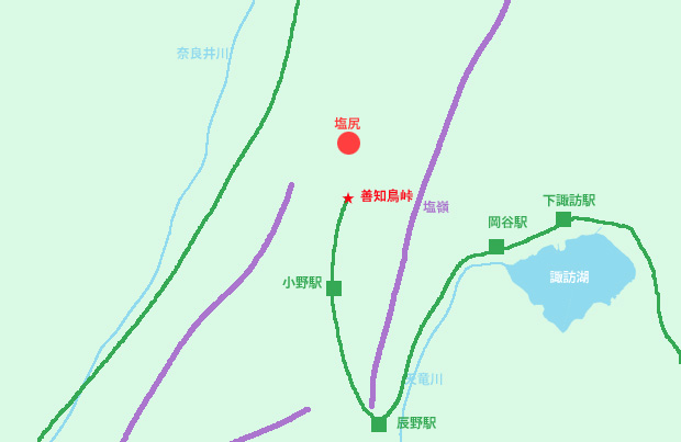 塩嶺を越えられなかった中央本線は大きく南に迂回し、横川川の作る谷を利用してかつて中山道の宿場として栄えた小野宿経由で北上した。サンドイッチマンのコントに「村上村村」という村が登場するが、こちらはコントなしに横川川(よこかわかわ)である。さて桔梗ヶ原に抜ける最後の関門はこちらも「善知鳥」と書いてうとう峠である。この峠が塩尻宿に近過ぎた。