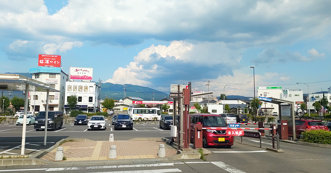 ここである。ボクは駅前駐車場にオーリスRSを慎重に停めた。何しろ上にジャイアントを積んでいるので料金所のテント屋根が引っかかりそうになる。駐車料金は30分無料である。