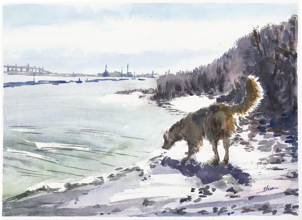 水に飛び込むチャンスを窺うゴールデンレトリバー B4大 Water on WhiteWatson